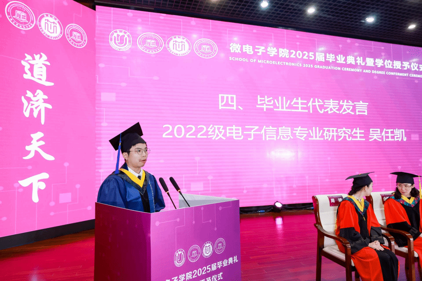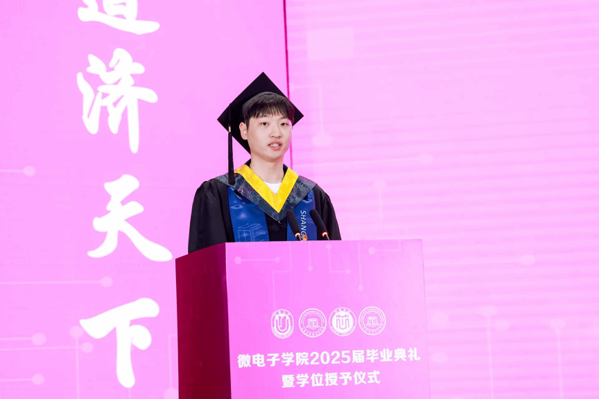 毕业生代表校长奖学金特等奖获得者张岩同学深情回顾了四年求学时光,感恩学院的培养和师长的教诲。他表示将带着校训精神投身“中国芯”事业,在科技报国中践行微电子人的使命。
