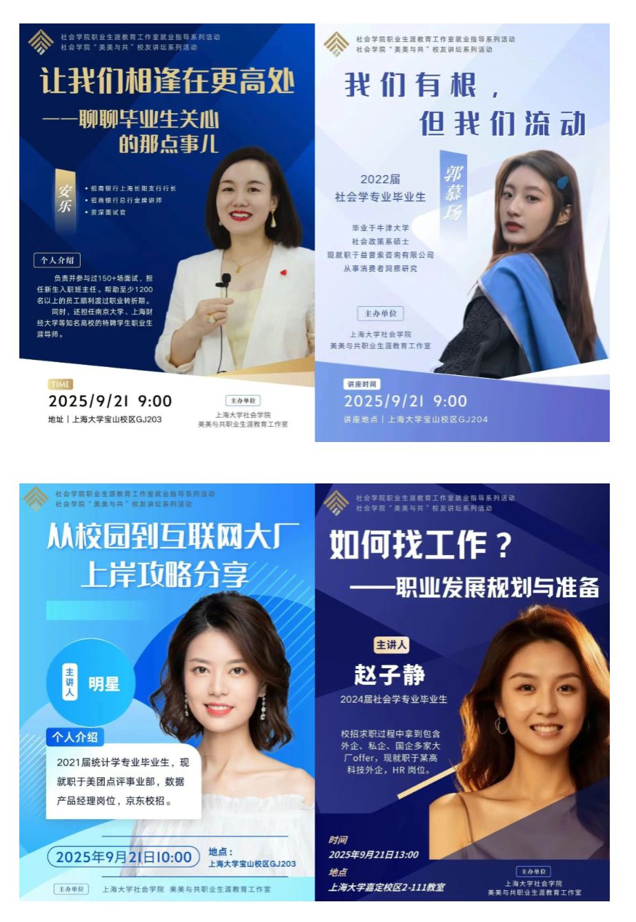 本次就业指导系列活动精心设计,精彩纷呈。针对不同学历和年级对象,安排了多个主题进行分层分类就业指导。特别邀请招商银行上海长阳支行行长、招商银行总行金牌讲师、资深面试官孙安乐,2022届社会学专业毕业生、牛津大学校友郭慕玚,2021届统计学专业毕业生、美团点评事业部数据产品经理明星,2024届社会学专业毕业生、就职于某高科技外企赵子静,为学生开展多层次、多角度的就业指导。针对本科学生侧重于职业认知与学业规划,面向高年级研究生则聚焦实习选择、面试技巧与就业能力提升,因材施教,助力学生明确自身未来方向。